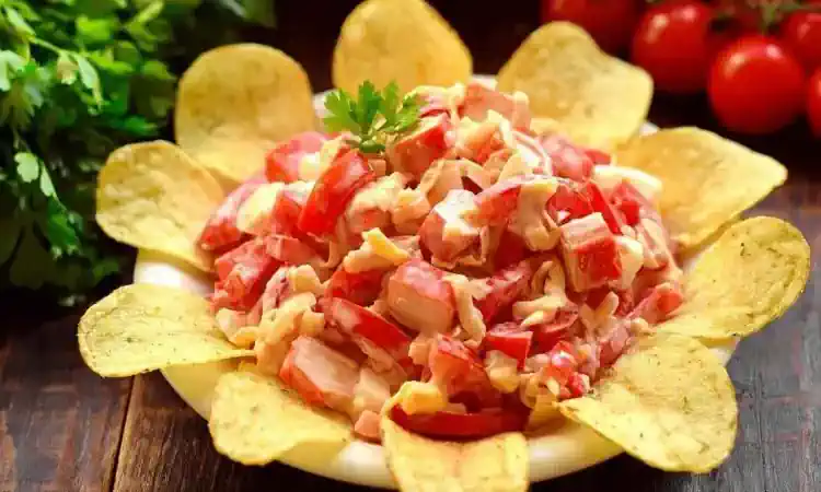 Такий салат часто подають до святкового столу, адже він має дуже апетитний вигляд. Страва ситна й проста у приготуванні. Салат з крабовими паличками та чипсами нагадує квітку.
